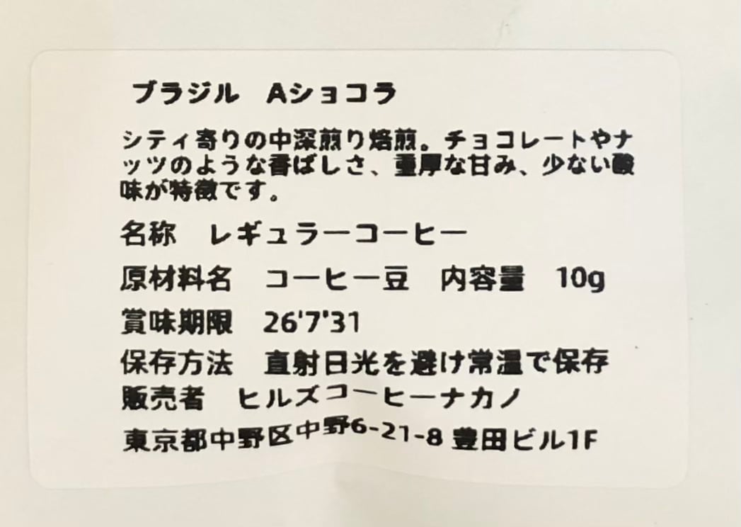 ヒルズコーヒー ナカノ「ブラジル Aショコラ」(シティロースト)